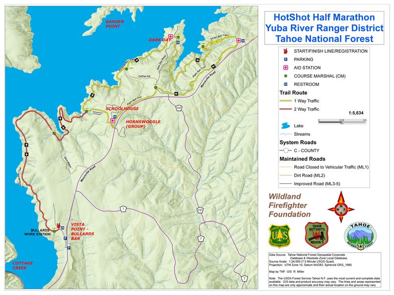 At the top of 7 ball you hit the 2nd Aid Station at the 7/8 ball intersection. Here you will find the Camptonville Volunteer Fire Dept providing some much needed support and encouragement. Catch your breath as you begin a rolling decent, winding and rolling downhill for just over a mile to the Dark Day Rd. The North San Juan Volunteer Fire Dept will be traffic control here...look both ways, then cross the road and continue on for about a mile to Schoolhouse campground and the final Aid Station, "Water Up and Fuel Up!!" This group of lively volunteers are guaranteed to fire you up for the final 4 mile push..."Leave it all on the Trail." Follow the markers and flagging to the Schoolhouse Trailhead, where you follow a connector trail for .75 mi back to the Bullards Bar trail. Hang a left. This is the only section of the trail you run twice, however the views of the lake are better the second time around. Its roughly 2 miles back to Sky Rd and from there, little over a mile to the finish line...